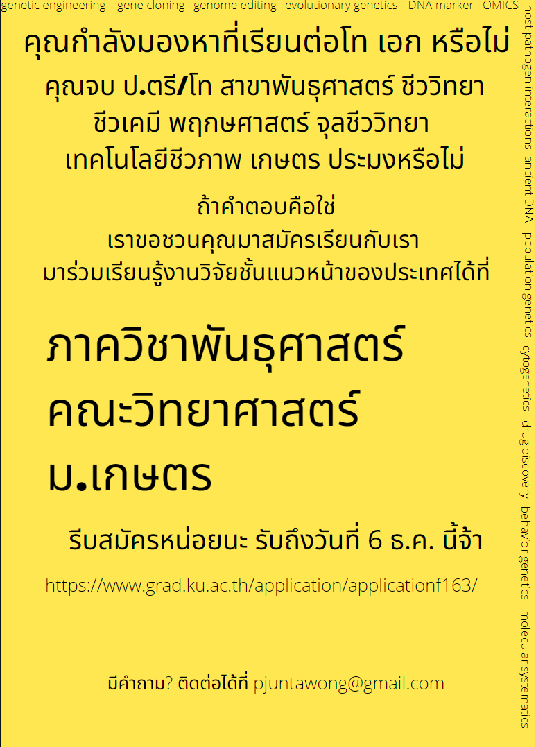M.Sc. (Genetics)/วท.ม. (พันธุศาสตร์) ศึกษารายละเอียดของหลักสูตรเดิมได้ที่นี่ รายละเอียด ข้อมูลของหลักสูตรปรับปรุง พ.ศ. 2564 ศึกษาได้ที่นี่ (ฉบับย่อ)