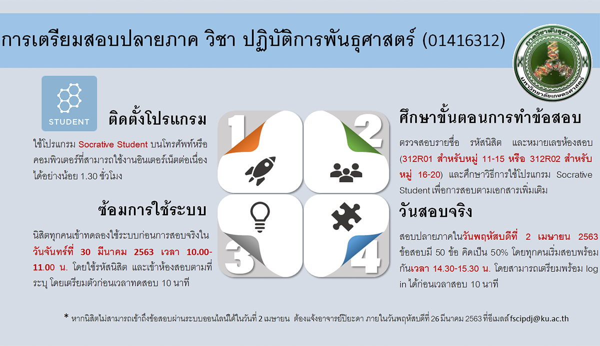 การสอบปลายภาควิชาปฏิบัติการพันธุศาสตร์ 01416312 March 24, 2020 admin คู่มือและขั้นตอนการสอบปลายภาค วิชาปฏิบัติการพันธุศาสตร์ 01416312 ประจำภาคปลาย ปีการศึกษา 2562 สามารถอ่านได้ ที่นี่